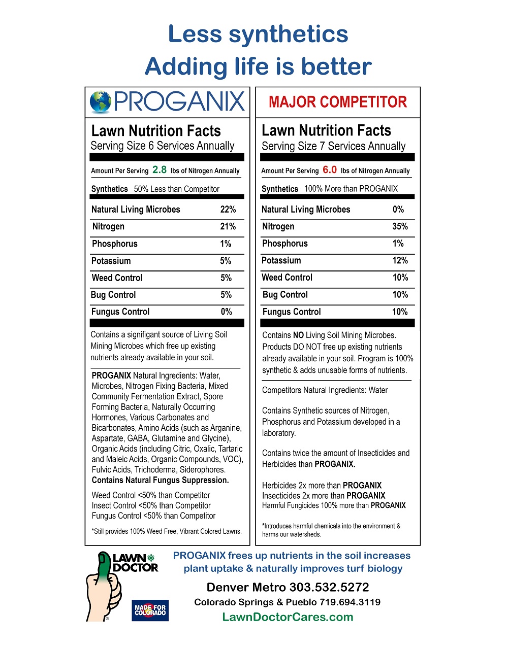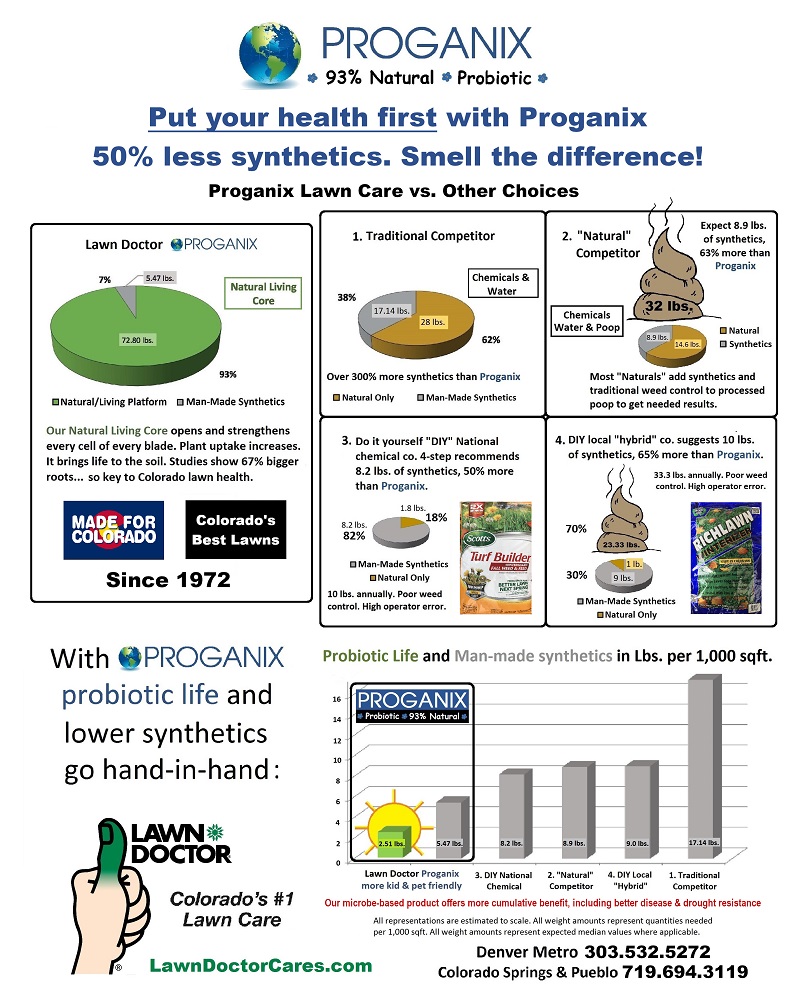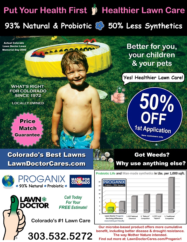 Since 1972, Lawn Doctor has been serving Denver and surrounding communities, providing the absolutely best in lawn and tree care. Today, they expand on that great service by offering a new product that is safe for pets, children and our vulnerable Colorado watersheds. Lawn Doctor exclusively offers Proganix. Proganix, when applied to your lawn, contains the living microorganisms necessary to restore your soil back to the way Mother Nature intended. For a lush lawn, you have to start at the soil and Lawn Doctor does just that. If you care about the environment and having a beautiful lawn, your next call should be to Lawn Doctor.