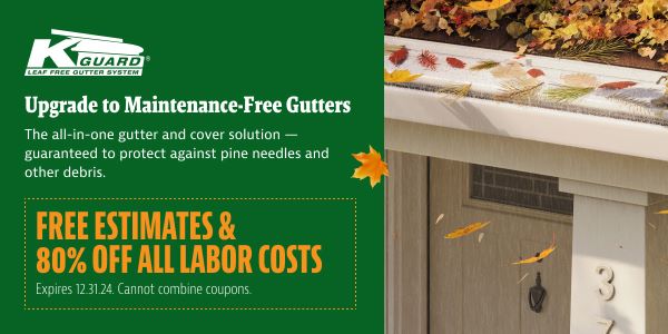 Upgrade to maintenance-free gutters and never get on a ladder again. The K-Guard Gutter System is the all-in-online gutter and cover solution. They guarantee a lifetime of clog-free living, saying goodbye to blockages forever.