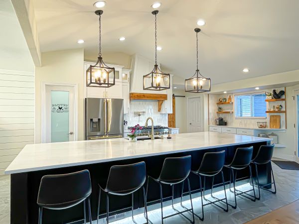 We were able to eliminate a non-structural wall and install a 13-foot island which made our new island and kitchen the heart of our new great room. We feel like we are living in a new house. The change was so dramatic.