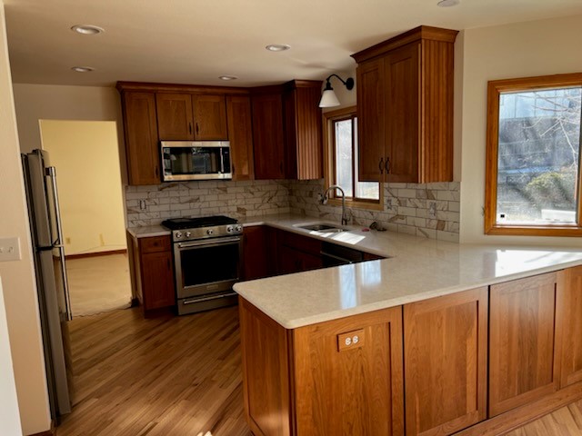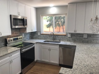 I love my home now with what they did for us. My favorite thing they did for us is the stone they did on the wall where our fireplace is and they put a mantle in as well. They also put a cabinet where the dividing half wall is from kitchen/den. They put a countertop over the storage cabinet and extended it into the den and created a bar area and it’s also a part of our kitchen table so our kitchen/den now seats 8 people and connects the den so it’s more inclusive. They also put glass mosaic backsplash and new can lights and pendant lights in the kitchen. Then tiled our entryways and laundry room with slate tile on the floors. I feel like I can entertain now because I love my home.