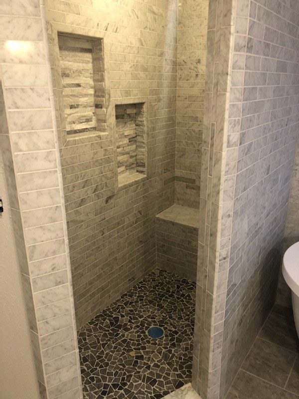 The upstairs projects they did for us was taking out our tub in master bathroom and turned it into a beautiful huge shower with bench and rain shower head and sprayer. The tile work is gorgeous! I get a lot of compliments on our tile work. Where the small shower was originally behind our bathroom door they put a huge nice beautiful oak linen closet. They also tiled both bathroom floors upstairs with the ceramic wood looking tiles.